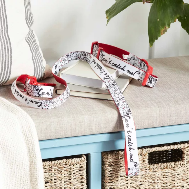 A pack of spotty pups are pictured on this dog collar inspired by Disney’s canine classic One Hundred and One Dalmatians. The playful pooches are accompanied by the inviting challenge ”Can’t catch me!”