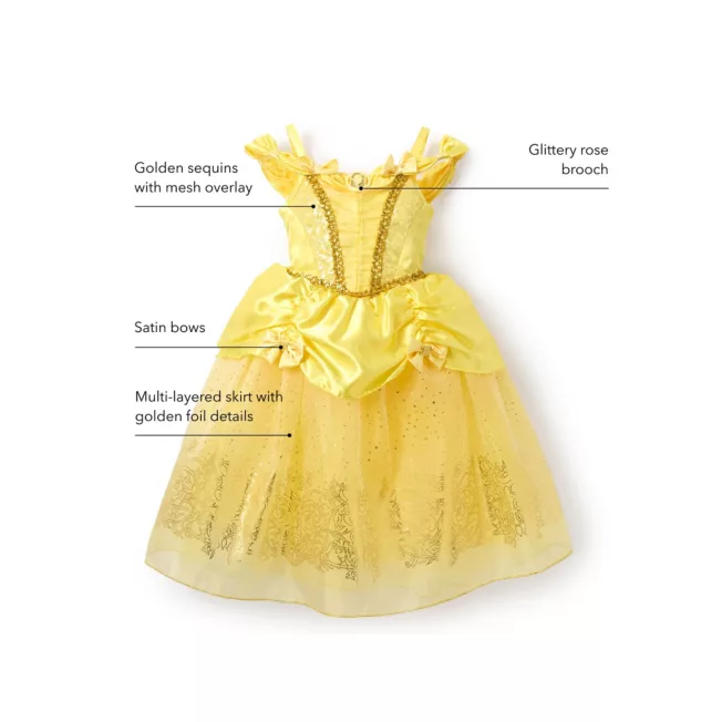 Relive a tale as old as time in our costume inspired by Belle’s breathtaking ballgown in Beauty and the Beast. Delicate satin bows, a sparkling rose brooch, sequined bodice and waist trim, layered skirts, fairytale foil filigree and golden trims create a miraculous transformation.