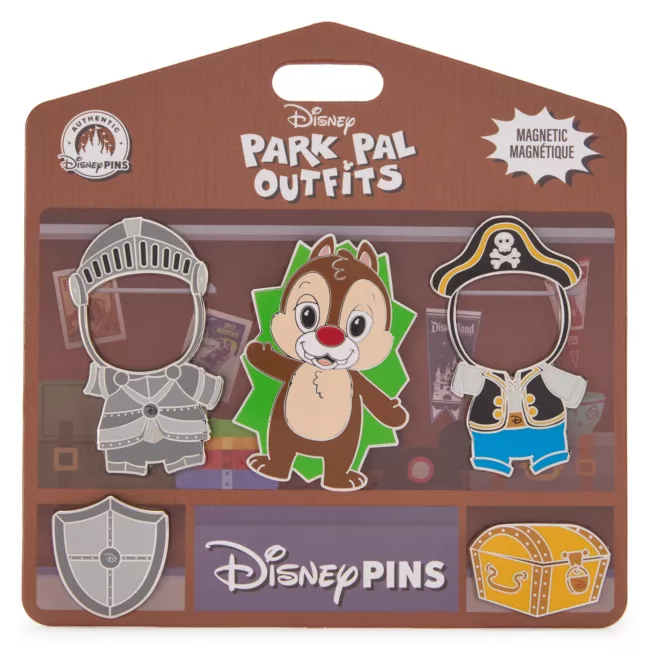 - Pin comprises of 5 pieces: Dale, knight outfit, shield, pirate outfit and treasure chest