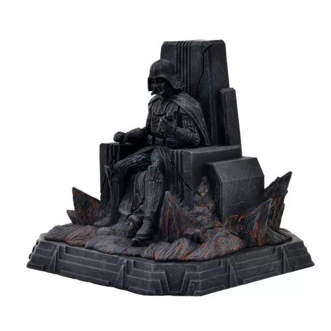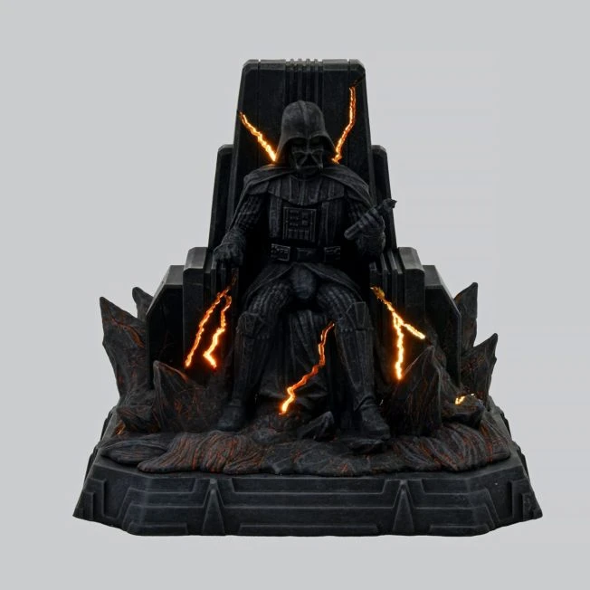 “You underestimate the power of the Dark Side. If you will not fight, then you will meet your destiny.” Sith Lord Darth Vader sits upon a throne. In his mind, he rules the galaxy with an iron fist and a cunning befitting a former Jedi Knight. Lightning bolts ”electrify” the mighty base of this formidable fully-sculpted figurine.