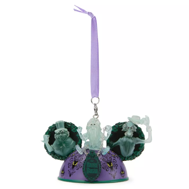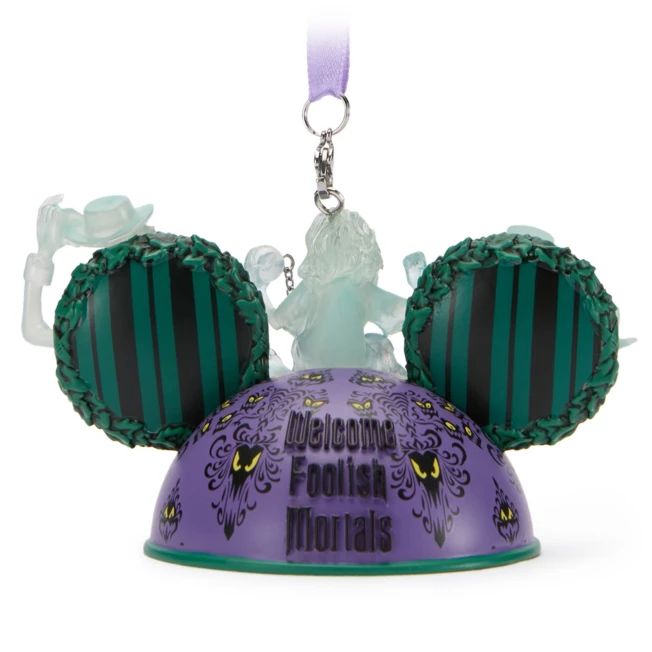 Beware of hitchhiking ghosts Ezra, Phineas and Gus who just might follow you home on this fully sculpted ear hat ornament featuring a seated translucent spirit lighted from within. With chains to rattle and that famous Haunted Mansion wallpaper pattern, it’s a terrifying topper for your Halloween tree.