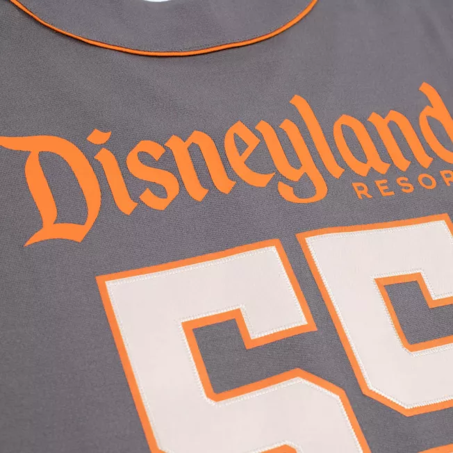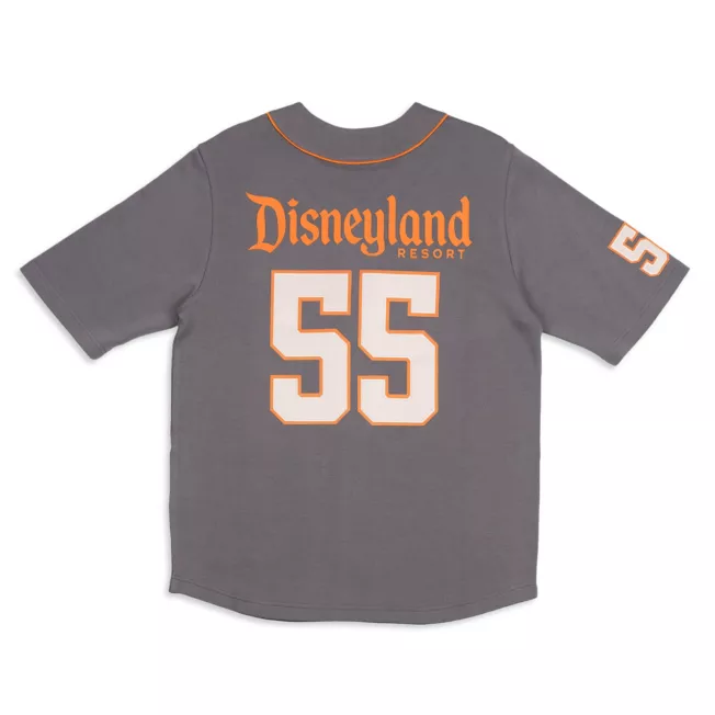 Team up with Mickey as you celebrate Halloween with this striking baseball shirt! Embroidery of Mickey as a jack-o’-lantern adorn the front, while a Disneyland Resort logo and “55” appliqué are featured on the back. Classic baseball jersey styling, including orange piping, shirttail hem and full button front, make it a real winner.
