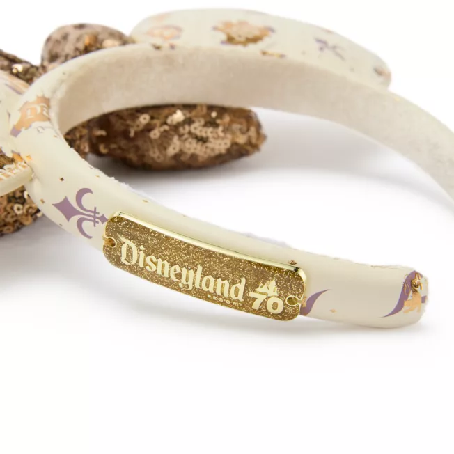Celebrate Disneyland’s 70th Anniversary wearing Minnie’s dazzling ears headband with golden sequined bow and simulated leather ears covered in a quilted print pattern of golden Sleeping Beauty Castle icons and Disneyland logos. You’ll have The Happiest Ears on Earth!
