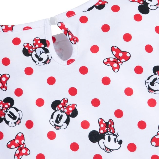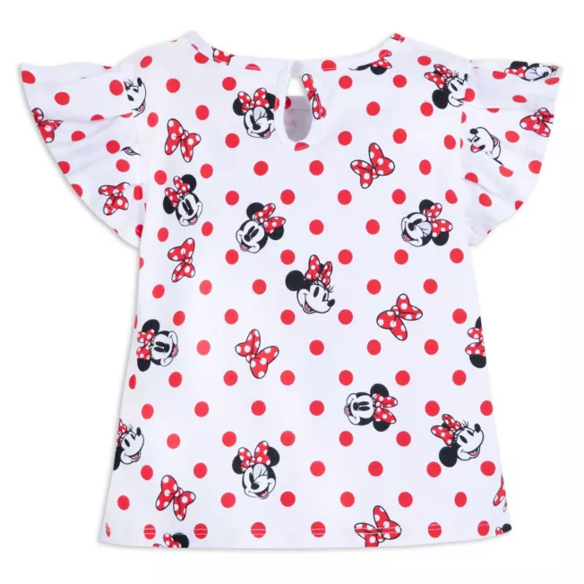 Minnie makes a frilly fashion statement with this adorable polka dot print top featuring ruffled wing sleeves, keyhole at back, and the many happy faces of Minnie herself!