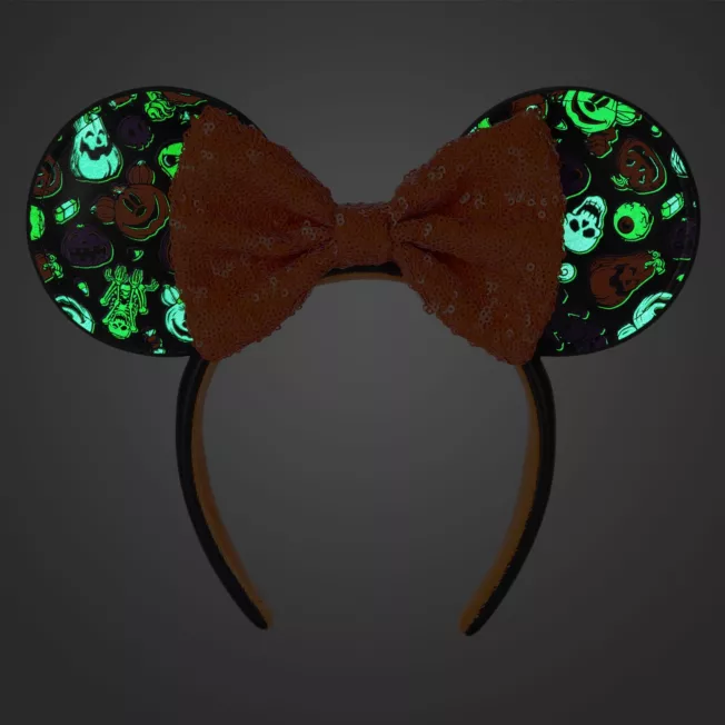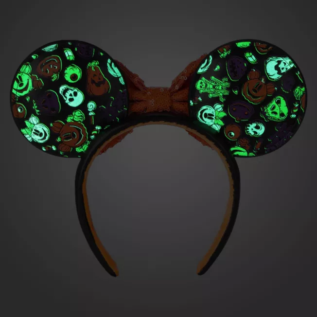Boo who? You won’t need tricks to look like a treat in this Minnie Mouse Halloween headband featuring an orange sequined bow and glow-in-the-dark ghouls printed on simulated leather ears.