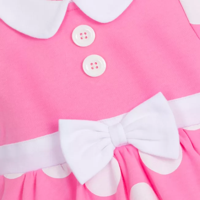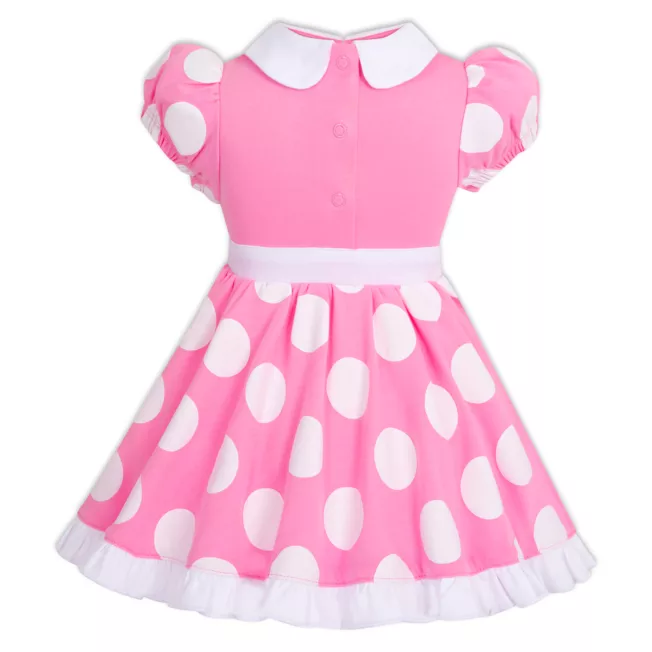 Baby will be pretty-in-pink wearing this Minnie Mouse costume bodysuit. Animated dreams are brought to life by the polka dot skirt and puffed sleeves, a ”Peter Pan” collar and mouse ears headband with bow.