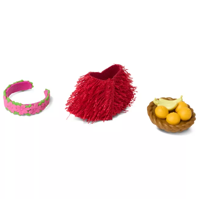 - Accessories include food plate, grass skirt and leaf-wrapped gift
