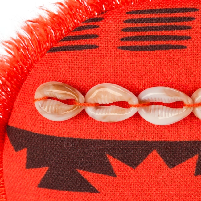 - Ears accented with puka shells and frayed edge trim