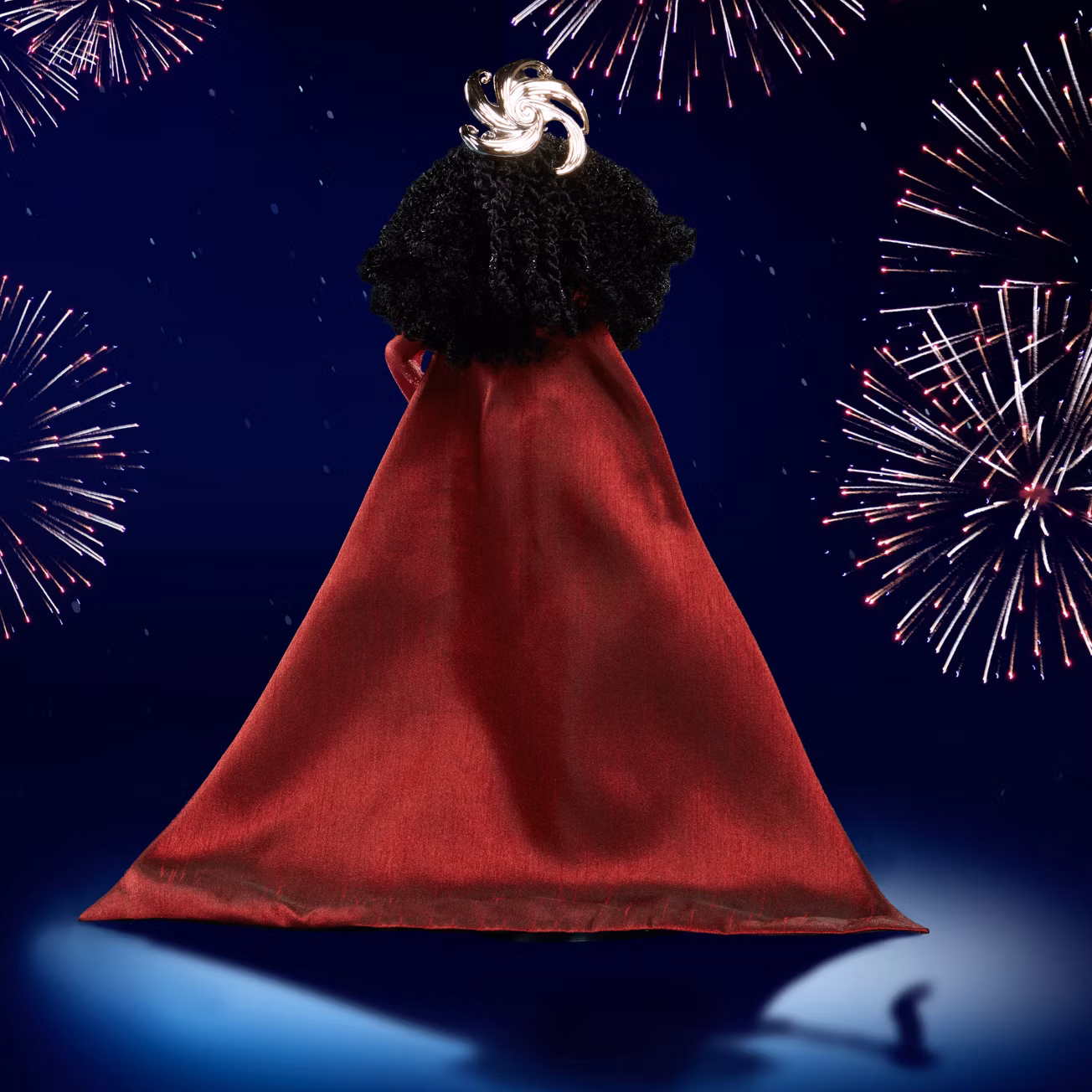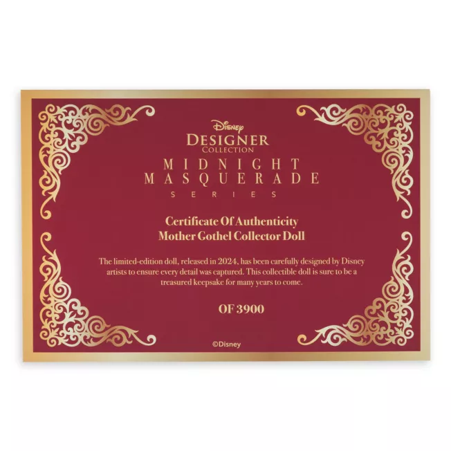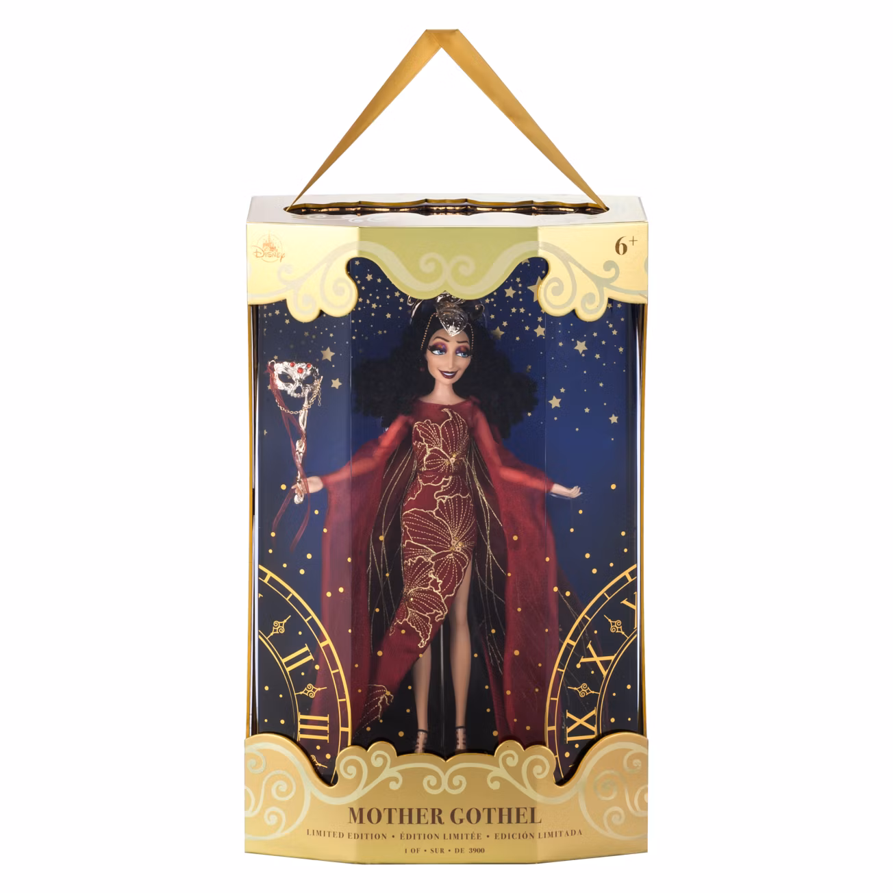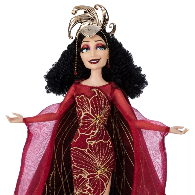 Mother Gothel climbs to new fashion heights with our Disney Designer Collection Midnight Masquerade Doll. Rapunzel’s gatekeeper breaks out of the mold in a sparkling split hem gown with train, golden floral embroidery, sequins and draped sleeves, plus golden accessories including mask and headdress with chainlink trims. Shed a glimmer of light on your collection with this elegantly costumed keepsake.