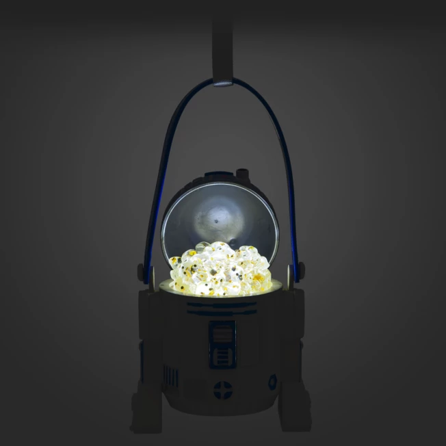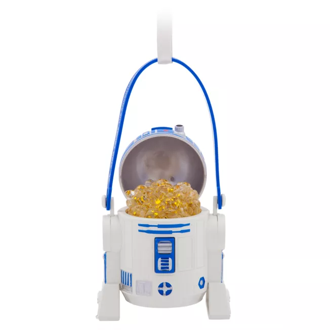 For those who ever wondered what was inside R2-D2 when you peered inside his head, well, it turns out it was ”popcorn.” This detailed replica of the astromech droid is inspired by the popcorn buckets found at the Disney Parks. Lift the silver and blue dome on this figural ornament too see a pile of shimmering ”popcorn” light up when you press his front vents.