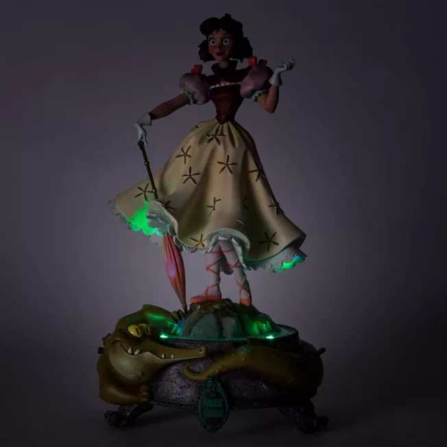Life is a balancing act! Sarah ”Sally” Slater’s ”stretching portrait” is seen in The Haunted Mansion. There, she stands poised on a tightrope above alligator-infested waters. In a story untold, she is perched on this base, ready to put on a show. Designed by Disney artist Steven Thompson, this spine-chilling figurine lights up at the base, casting an eerie multi-coloured glow from below. Step up and take this daring collectible home to stay.