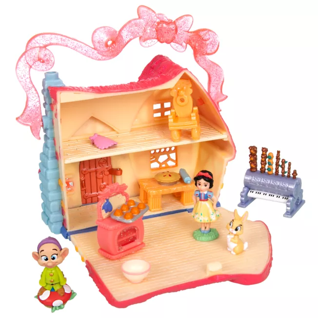 - Set includes Snow White’s Cottage, Snow White figure, Dopey figure, oven, apron, rolling pin, muffin tray, mixing bowl, chair, organ, bunny, table with pie