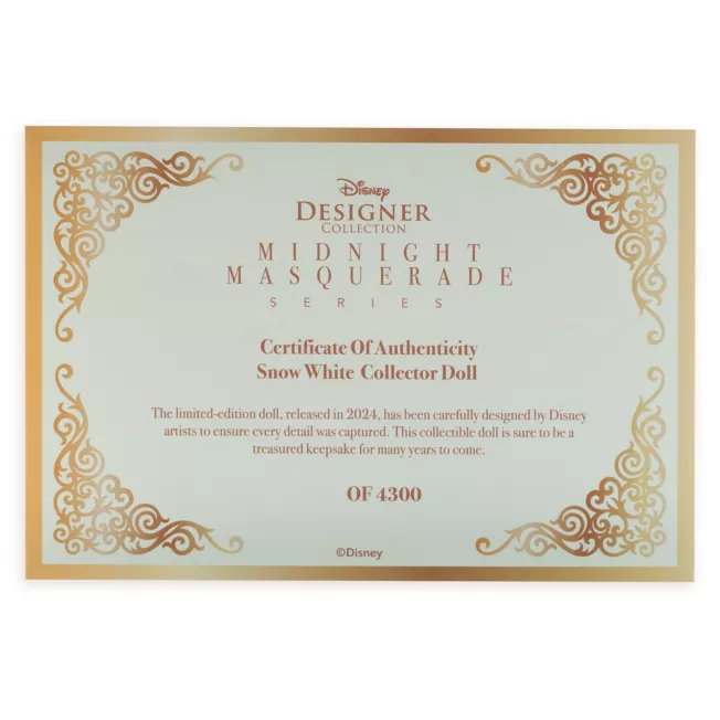 Unquestionably the most angelic in the land, Snow White casts a spell of enchantment on our Disney Designer Collection Midnight Masquerade Doll Series. Clad in a breathtaking couture gown with intricate embroidered and jewelled accents, sheer shimmering underskirts and puffed sleeves, satin cape, plus dramatic golden stand-up collar, tiara and hand mask, Disney’s original princess makes an eye-opening impression not soon forgotten.