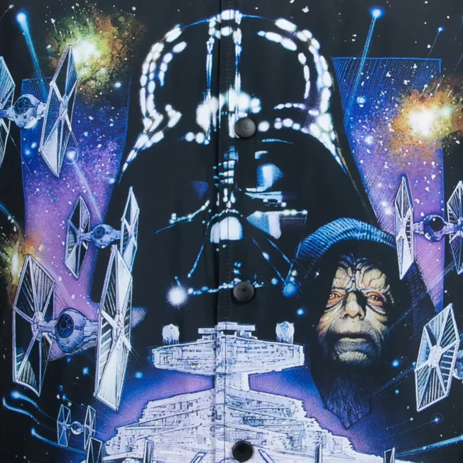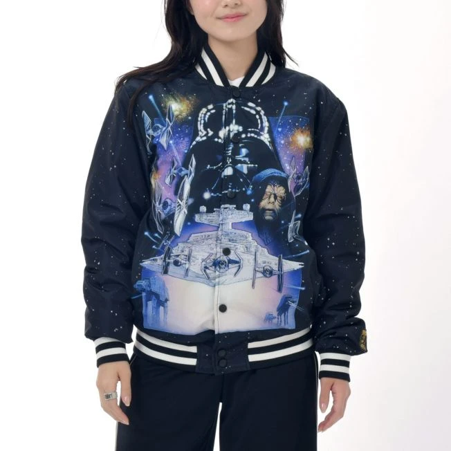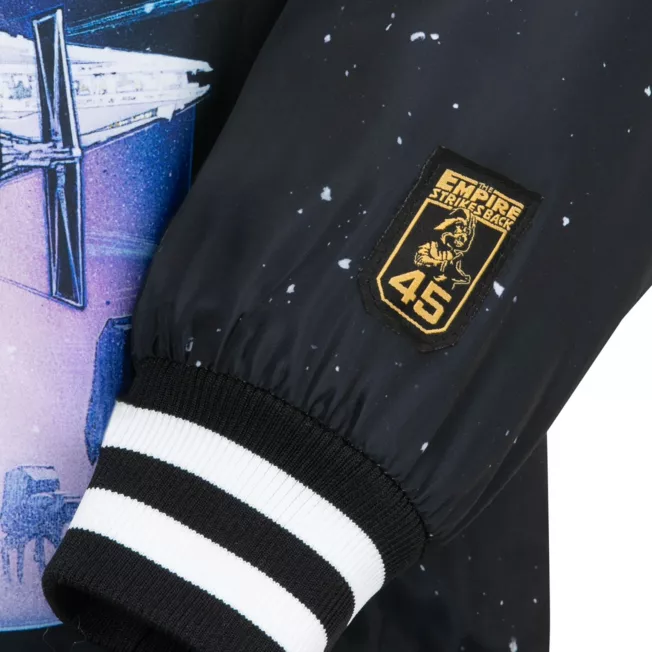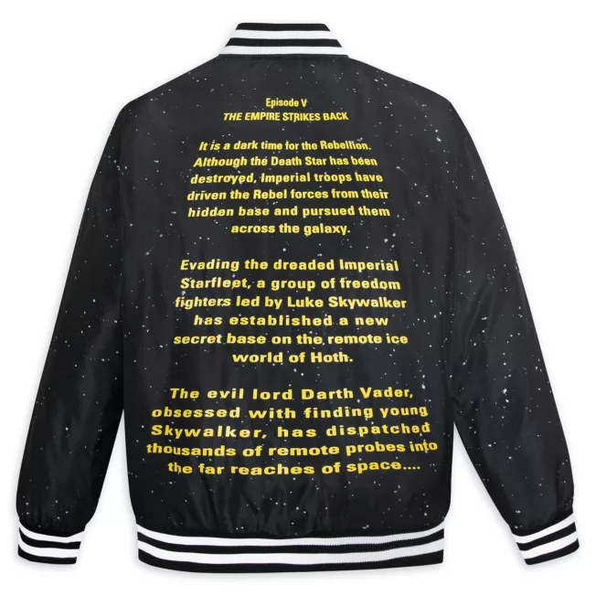 Relive the thrill of watching the opening scroll of Star Wars: The Empire Strikes Back fill the screen every time you put on this jacket celebrating the film’s 45th anniversary. The iconic scroll is printed on the back, while imposing screen art of Darth Vader, Emperor Palpatine and Empire fighters commands the front. With an all-over galactic backdrop, this jacket celebrates the timeless film with classic styling including front snaps, striped ribbing and light filling for a look to thrill every fan.