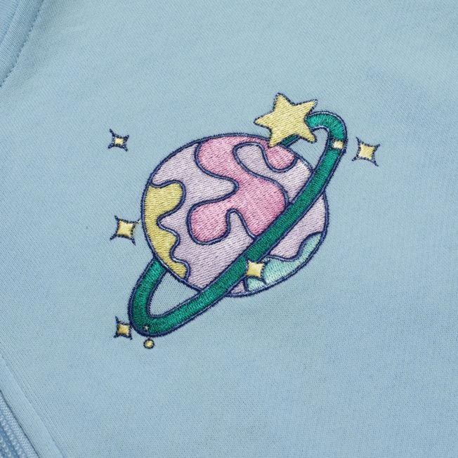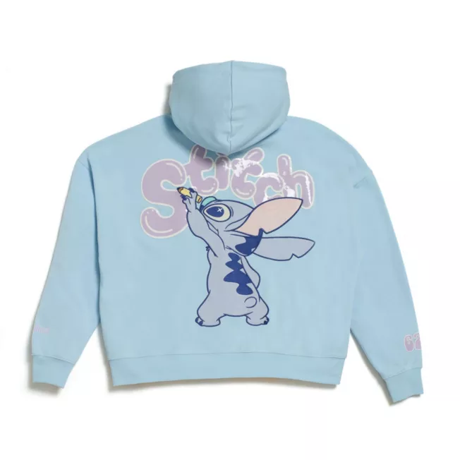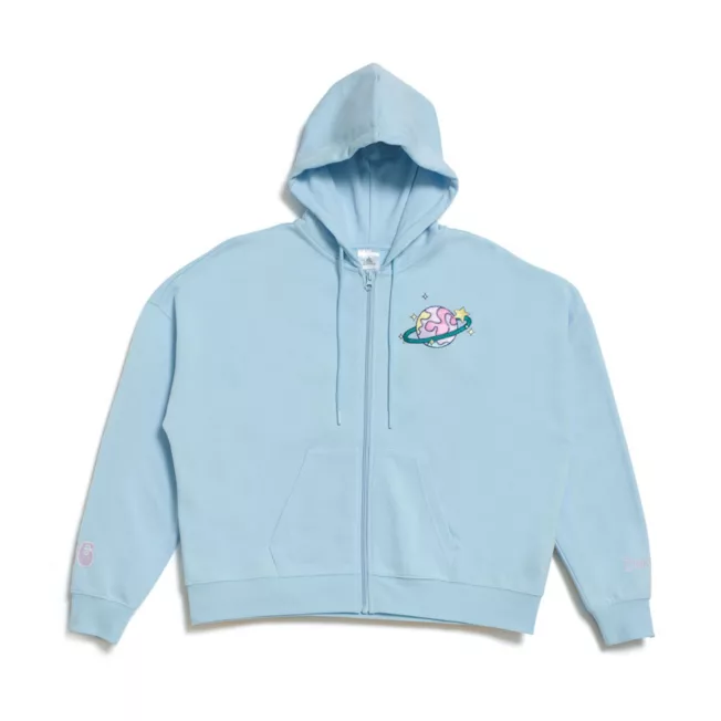 Your look will be out of this world when you don this fashion experiment featuring space alien Stitch. The pastel hooded sweatshirt features a zip-up design and embroidered character artwork.