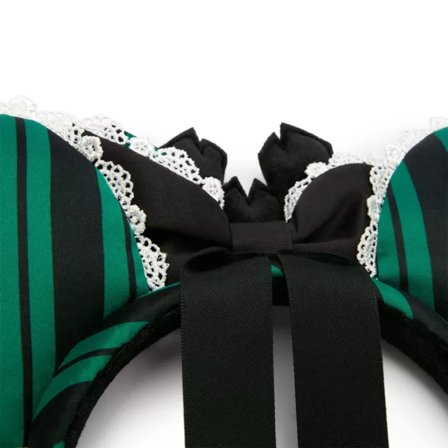 Thrilling frills and striking stripes highlight this eerie-sistible Haunted Mansion Ghost Host ears headband. Inspired by the attraction’s iconic Cast Member outfits, this timeless accessory is topped with a bow accented with a midnight-black bat brooch and long satin ribbons that hang down the back. Put it on to create a truly immortal look.