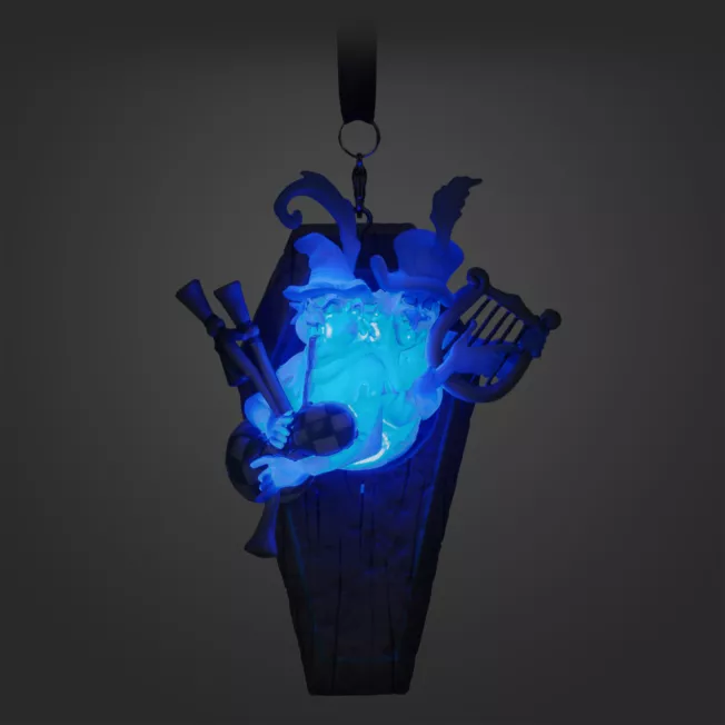 Two grim, grinning members of The Haunted Mansion‘s musical quintet, The Phantom Five, appear on this sculpted casket ornament and are happy to hang around your house for awhile playing the bagpipe and harp. Harpy Holidays!
