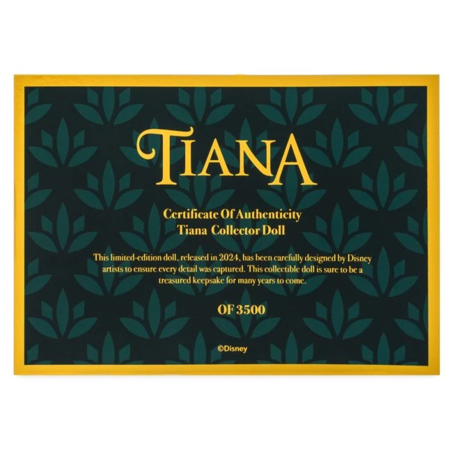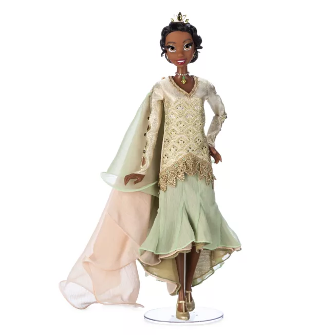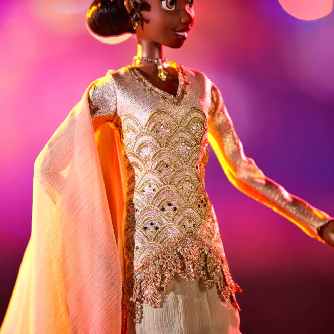 Disney is proud to present this limited-edition Tiana doll in celebration of the new Tiana’s Bayou Adventure attraction at Walt Disney World Resort and Disneyland Resort. This dazzling collectible is inspired by the initial concept art from Disney’s award-winning costume designer, Ida Muldrow. For Tiana’s mansion party gown, Ida drew inspiration from the 1920s era of glimmering glamour and elegance, epitomising the beauty of the bayou princess.