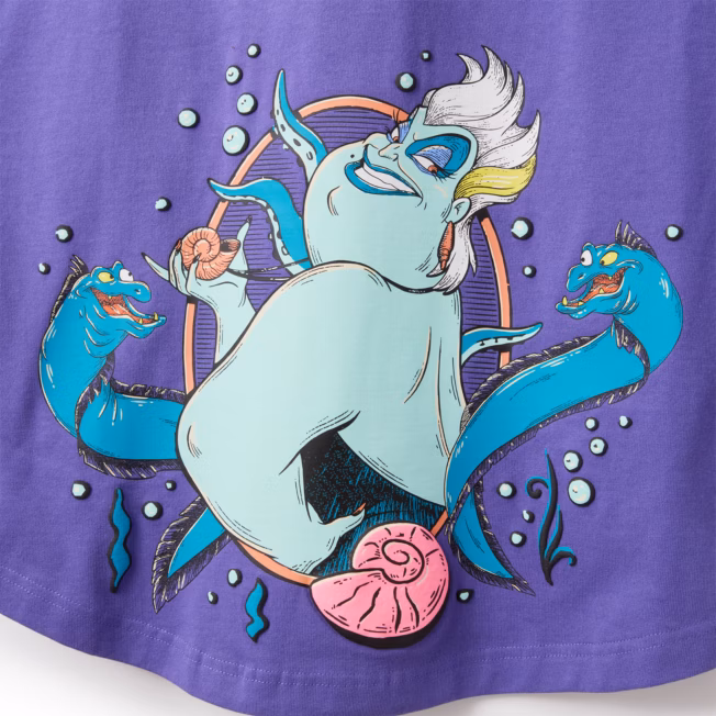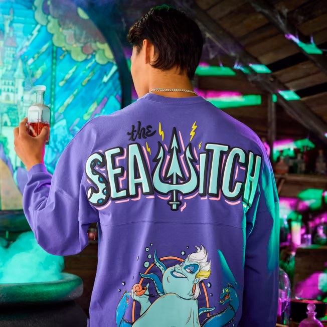 Make a splash with this spellbinding Ursula Spirit Jersey, where villainy meets vogue. Featuring the sea witch herself striking a commanding pose, this jersey is a tribute to the queen of the deep. With Flotsam and Jetsam slinking at her sides and a swirling oceanic backdrop, Ursula’s presence is as powerful as ever. Across the back, bold puff-print lettering declares your allegiance: ‘SEA WITCH’ – because subtlety is overrated. Crafted for comfort with a relaxed fit and soft, premium fabric, this Spirit Jersey is perfect for park days, villain meet-ups, or just channelling your inner sea soul.