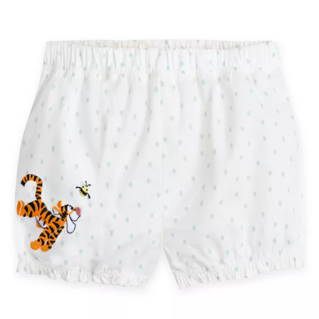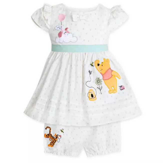 Winnie the Pooh and Tigger too, and don’t forget Piglet, are embroidered on this adorable dress and bloomers set. With darling details like pretty little polka dots, ruffled cap sleeves and a ribbon waistband, it’s perfect for parties and playtime alike.