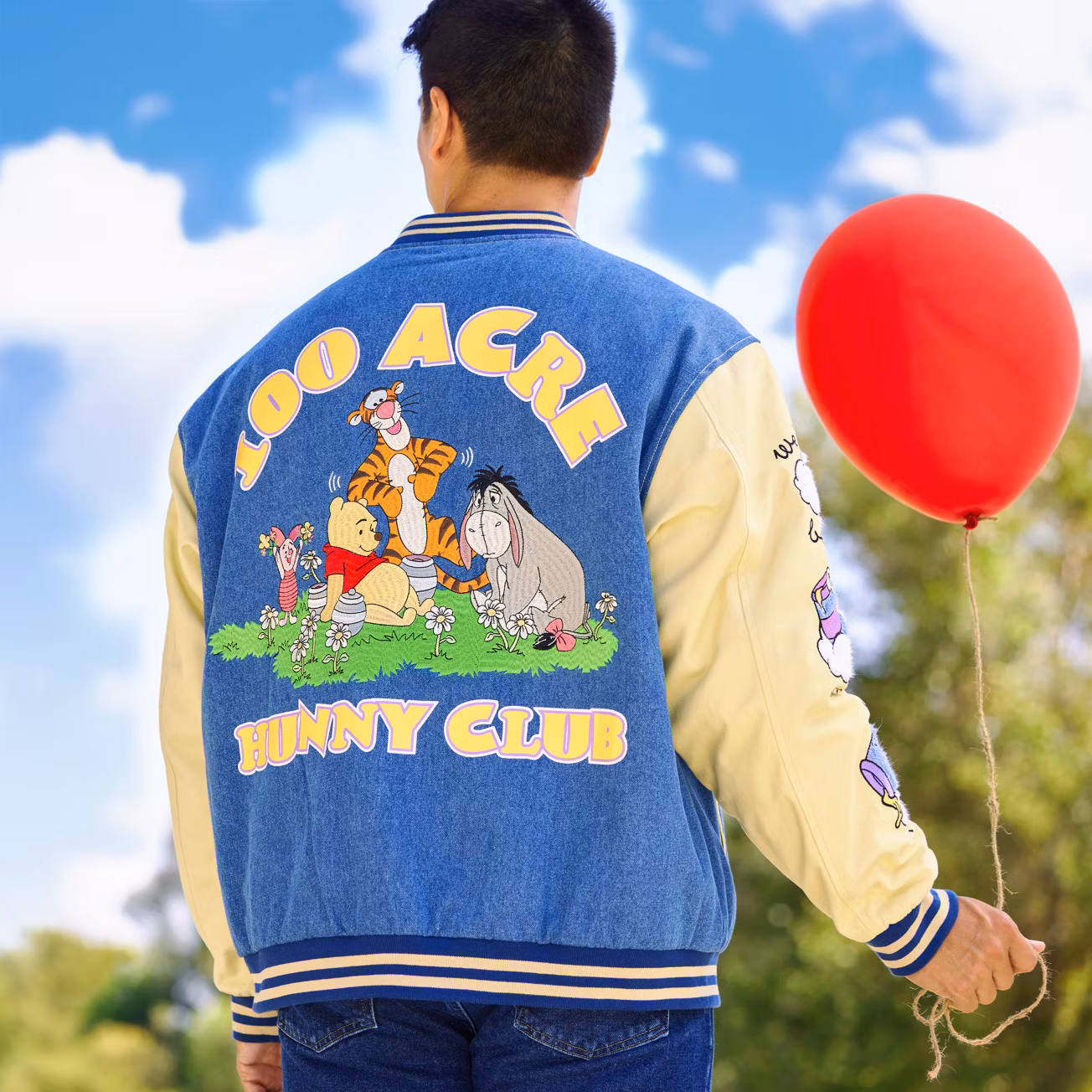 Stylish and fun, this Winnie the Pooh varsity jacket features the ”100 Acre Hunny Club,” otherwise known as Pooh, Eeyore, Piglet and Tigger. The comfy, classic style features a denim body and twill sleeves highlighted with embroidered and screened art and words to delight you and maybe your hunny, too.